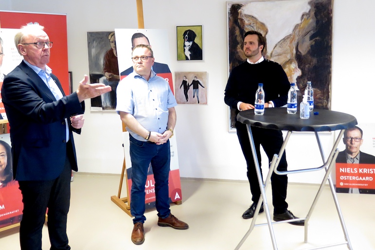 Tage Odgaard (t.v.) og Michael Hansen fik en debat med erhvervsminister Simon Kollerup (S) om ønskerne fra Mors til ministeriet. Foto: Redaktionen